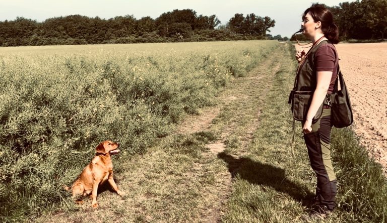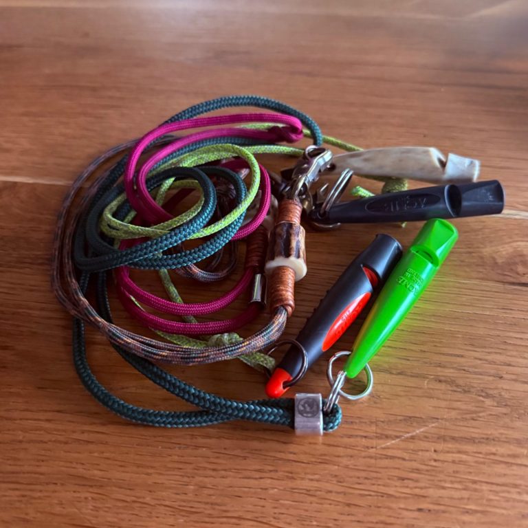 Damit wir unsere Hunde auch auf größere Distanzen sicher lenken können, integrieren wir die Pfeife von Beginn an ins Training. Sie ist ein unverzichtbares Hilfsmittel in der Dummyarbeit und unterstützt uns auch im Alltag: Gut konditionierte Signale wie der Stopp-Pfiff oder der Komm-Pfiff erleichtern die Kommunikation mit dem Hund erheblich.